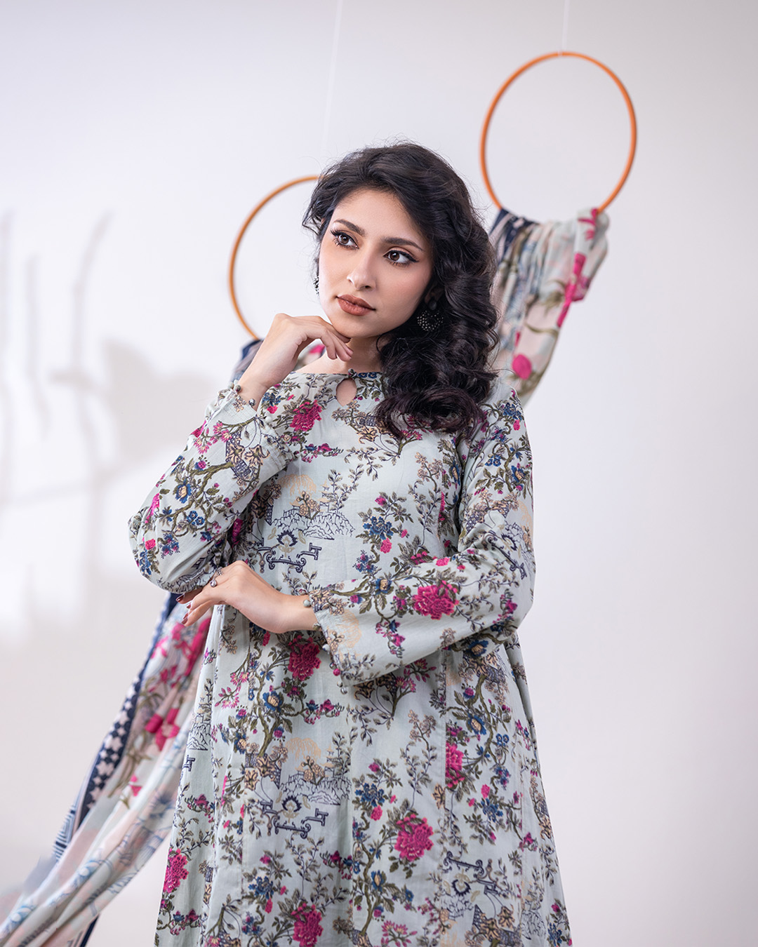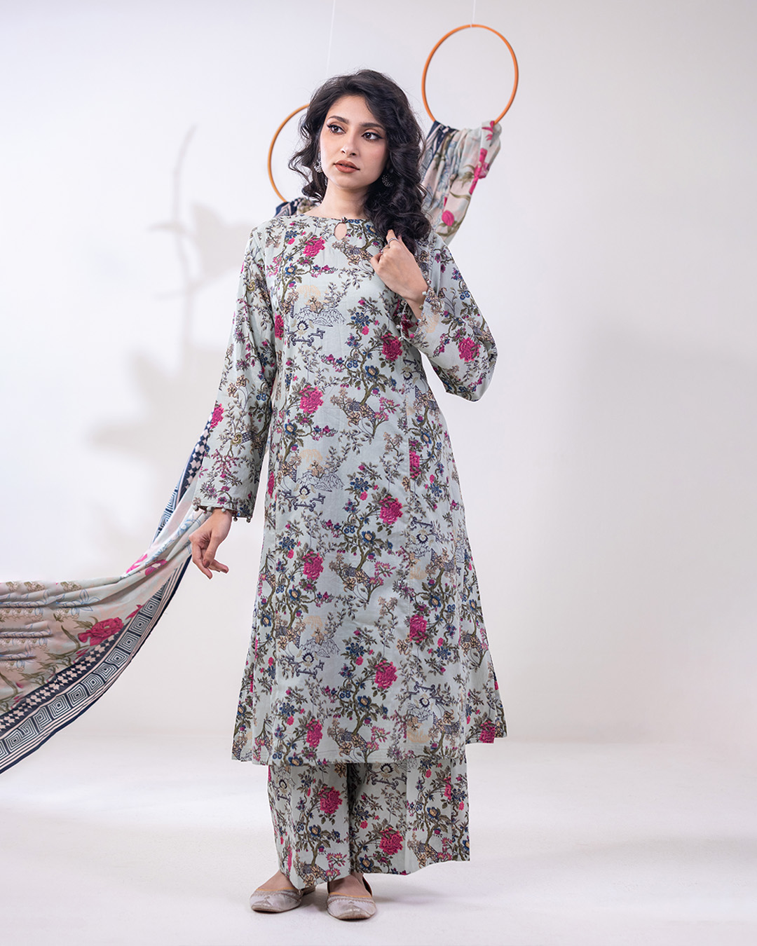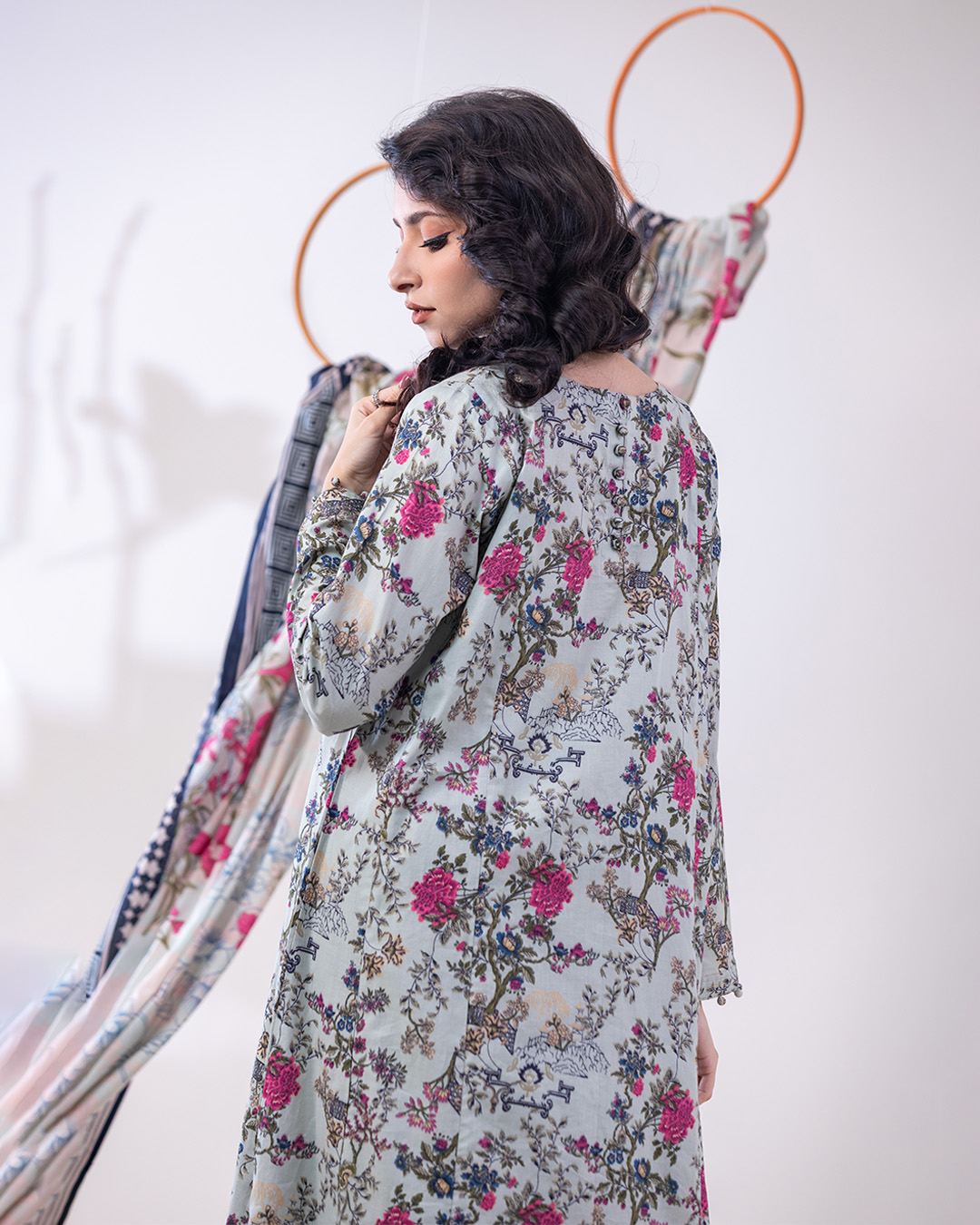 Airy lawn meets bold geometrics. A regular-fit kameez with pockets, straight pants, and a printed dupatta create a look that’s clean, refined, and quietly striking.